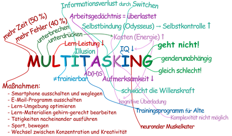 Unser Gehirn funktioniert nicht im Mehrprogramm-Betrieb! Das Bedeutet, dass Multitasking nicht geht. Man kann es auch nicht trainieren! Auch Frauen können das nicht. Auch wenn uns das nicht gefällt. Wesentliches dazu habe ich in dem Wortbild zu MULTITASKING zusammengefasst.