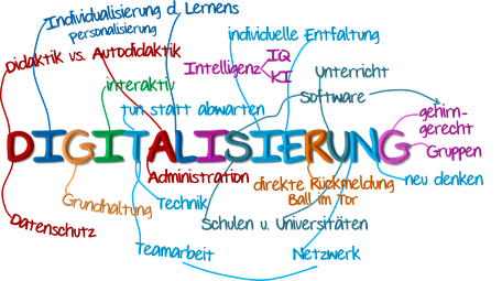 Das Wortbild unten ist ein Gedanken-Schnappschuss zur DIGITALISIERUNG in der Lern-Welt und bezieht sich auf Lernen in Schulen, Universitäten und Weiterbildung.