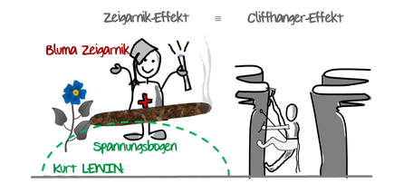 Der Zeigarnik-Effekt ist auf Bluma Zeigarnik, den Namen seiner Entdeckerin, zurückzuführen. Hier lässt sich zusammen mit dem Namens-KaGa gleich auch der Effekt zeichnen. Bluma Zeigarnik stellte vor 100 Jahren fest, dass Menschen sich an nicht beendete Lernprozesse besser erinnern als an zu Ende geführte Aufgaben. Wir kennen diesen Effekt auch als Cliffhanger. Beides in einer einfachen Zeichnung zusammengeführt, bleibt uns in Erinnerung.