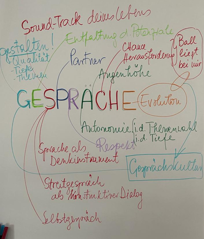 Ich schreibe GESPRÄCHE groß in Druckbuchstaben in die Mitte eines Blattes Papier. Meist quer, aber diesmal sogar auf den Flip, weil ich dann stehend denken kann und durch Bewegung immer wieder den Blickwinkel verändere. Probieren Sie es aus!
