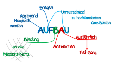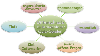 Da das Wissens-Quiz-Spiel in erster Linie der Wissensvermittlung dient, beziehen sich alle Fragen auf ein Thema und auf die wesentlichen Schlüsselbegriffe. Die einzelnen Fragen beleuchten die Kernaussage aus verschiedenen Perspektiven. Dadurch rundet sich das Bild ab.