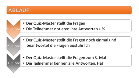In der 1. Spielrunde stellt der Referent, Lehrer die Fragen und jeder der Mitspieler beantwortet diese auf einem Blatt Papier, ganz für sich. Er notiert auch kurz, wie sicher er sich seiner Antwort ist.