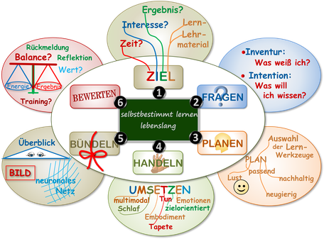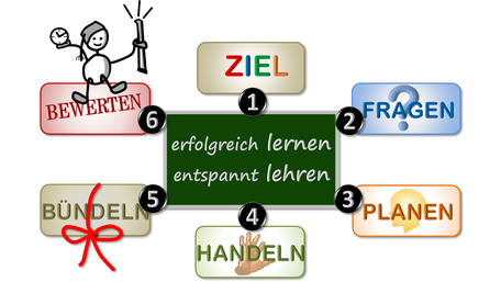 Drucken Sie sich das Mind-Cluster mit den 6 Schritten des Lernprozesses aus. Vielleicht in dieser einfachen Form:
