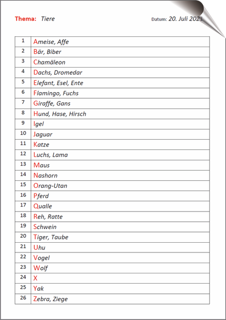 Weiter unten sehen Sie ein Beispiel für eine Tierliste. Auch darin sind mehrere Tiere bei einem Buchstaben und Buchstaben ohne Tiere. Und ihnen fielen noch viele Tiere ein, die man hier eintragen könnte.